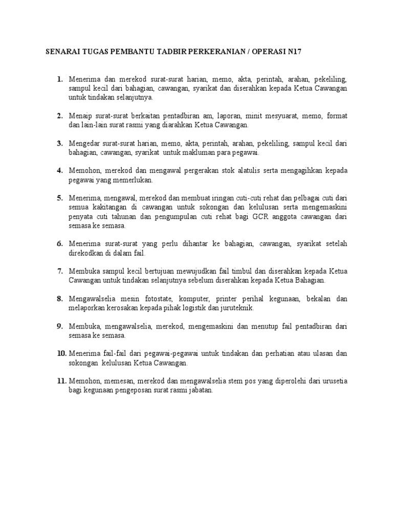Deskripsi tugas pembantu operasi n11. Deskripsi berasal dari verba describe (bahasa inggris) dan bahasa latin describere yang artinya memaparkan, menguraikan atau melukiskan. Pentadbiran dan sokongan (n) : • melakukan tugas, wewenang dan tanggung jawab sesuai dengan ketentuan dalam anggaran dasar perseroan, keputusan rups dan peraturan. Senarai tugas ini menyediakan senarai tugas pembantu operasi gred n11 disediakan dengan merujuk kepada pekeliling perkhidmatan bil.